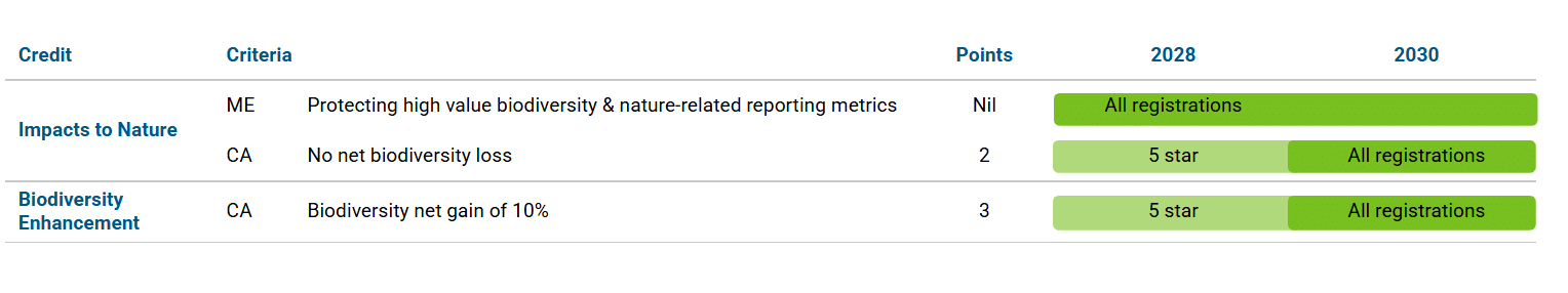 - Projects pursuing a 5 or 6 Star rating must demonstrate a 10% net gain in biodiversity (when registering from 2028).
