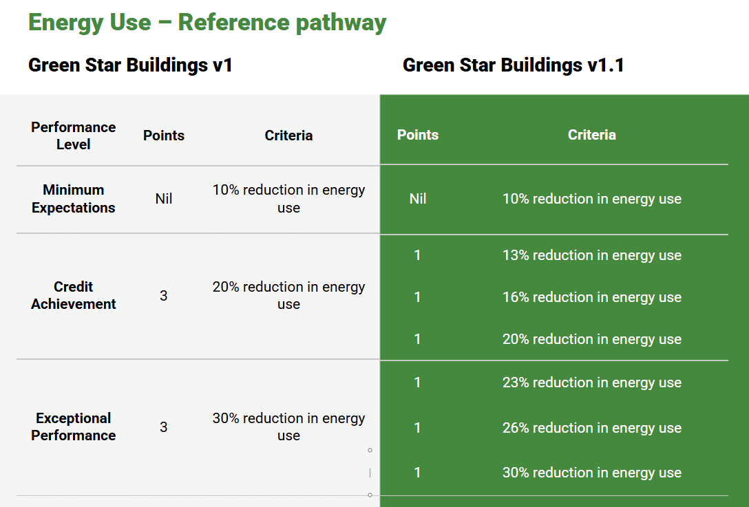 Green Star Buildings v1.1 introduces stepped points for selected credits with quantitative benchmarks. This allows projects to be recognised for performance achieved between levels.
